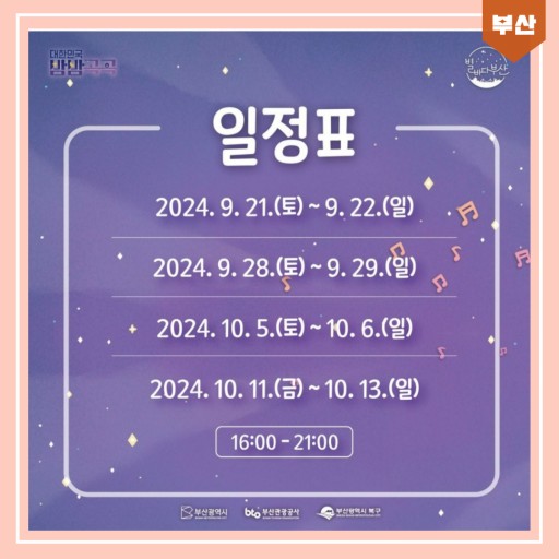 부산은 매년 많은 문화 예술 행사가 열리는 도시로 유명한데, 그 연장선에서 부산의 다채로운 문화를 체험할 수 있는 특별한 기회를 제공합니다. 지역 아티스트들의 공연과 각종 문화 행사가 진행되어, 볼거리와 즐길 거리를 선사합니다.