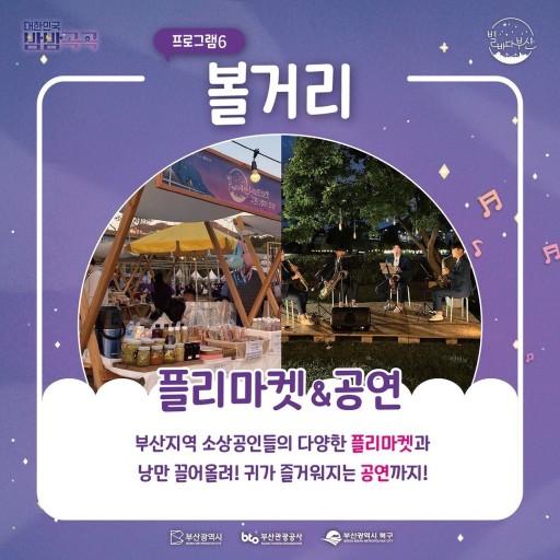 어쿠스틱 밴드의 부드러운 선율부터 재즈, 록, K-팝까지 장르를 넘나드는 다양한 공연들이 열리며, 이곳에서의 라이브 음악은 마켓의 분위기를 더욱 흥겹고 생동감 있게 만듭니다. 야경을 배경으로 펼쳐지는 음악 공연은 부산의 낭만적인 밤을 더욱 특별하게 느끼게 해 줍니다.
