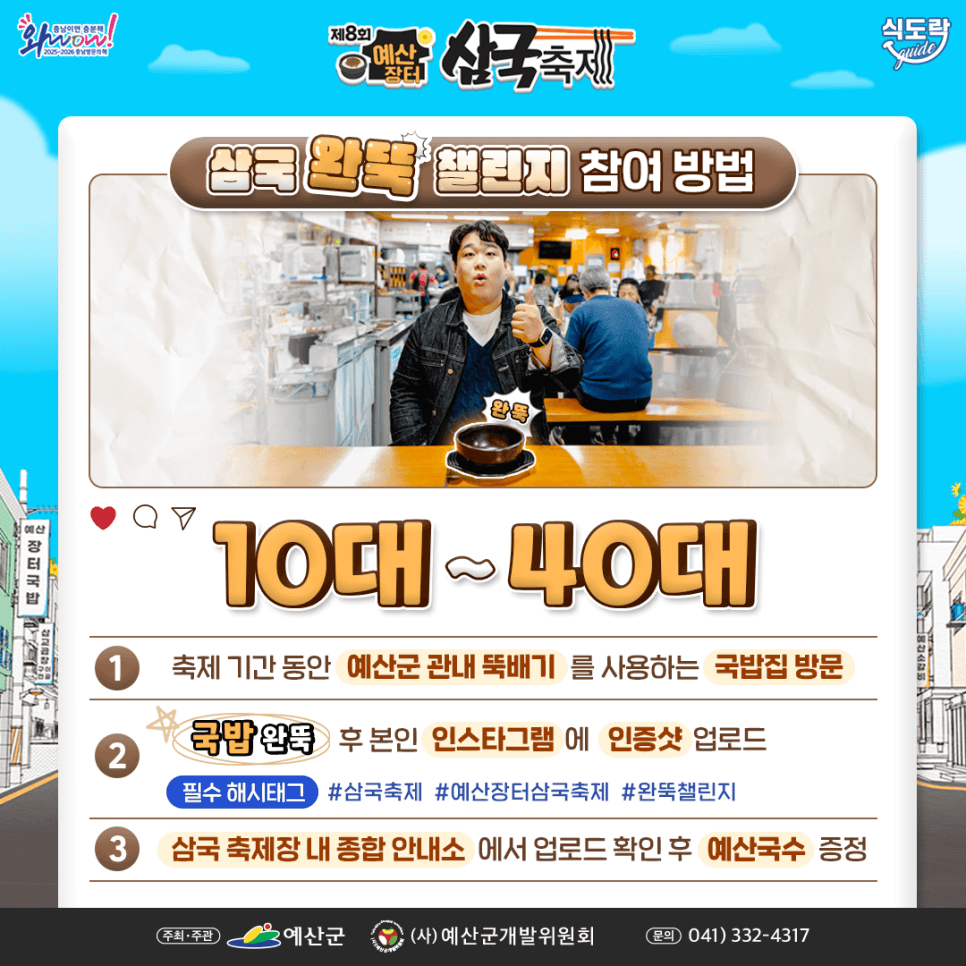 예산군 관내 뚝배기를 사용하는 ‘국밥집’ 방문 후 ‘왁뚝’ 인증샷을 찍으면 ‘예산 국수’를 드려요!