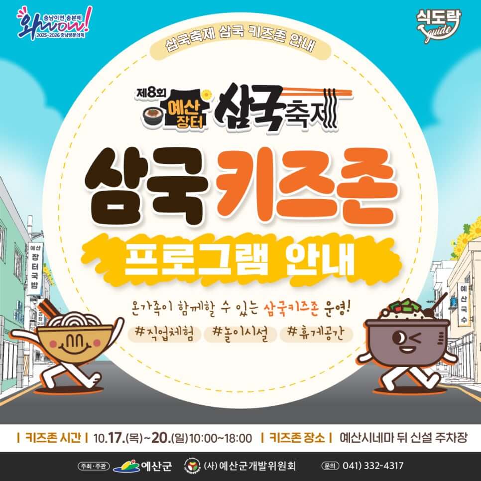 제8회 예산장터삼국축제는 국화 국밥 국수를 콘텐츠로 하는 예산군 대표축제로 올해는 음식문화축제와 친환경을 중심으로 방문객들에게 예산군의 식도락 여행을 안내하는 가이드로서의 역할을 담당하고자 한다.